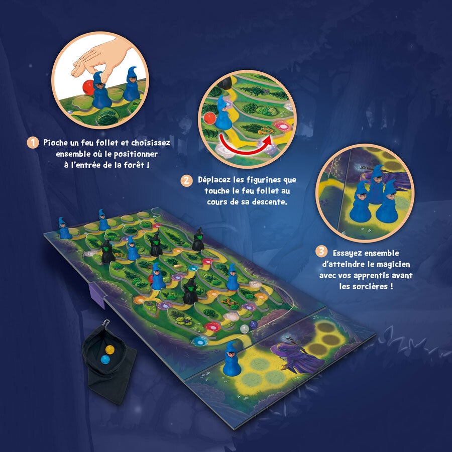 De méchantes sorcières ont décidé de dérober le cristal magique du grand enchanteur! En tant qu'apprentis, vous devez les en empêcher et rejoindre le bas de la colline avant elles. Suivez les feux follets à travers les chemins sinueux de la forêt: Faites descendre les billes en déplaçant chaque figurine qu'elles touchent vers le point de couleur suivant jusqu'à ce que la bille arrive tout en bas. puis on pioche une autre bille et on recommence. Si les apprentis arrivent près de l'enchanteur avant les sorcières, c'est gagné!