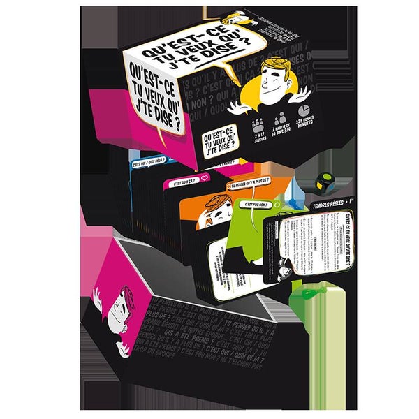 Pas de plateau, pas de figurines, pas de règles complexes : Qu’est-ce tu veux qu’j’te dise ?! est un jeu d’ambiance de questions/réponses avec 1 000 questions réparties en 5 thèmes mélangeant culture, insolite et absurde.