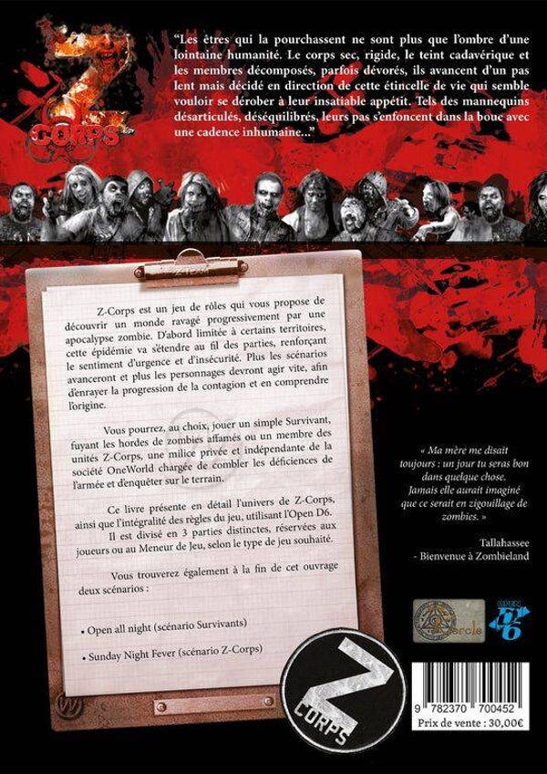 Vous pourrez, au choix, jouer un simple Survivant, fuyant les hordes de zombies affamés ou un membre des unités Z-Corps, milice privée et indépendante de la société OneWorld chargée de combler les déficiences de l’armée et d’enquêter sur le terrain. Ce livre présente en détail l’univers de Z-Corps, ainsi que l’intégralité des règles du jeu, utilisant l’Open D6. Il est divisé en 3 parties distinctes, qui sont réservées aux joueurs ou au Meneur de Jeu, selon le type de jeu souhaité.
