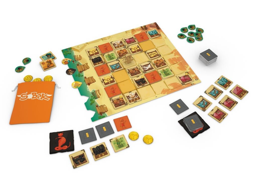 Dans Sobek 2 joueurs, deux adversaires collectent et vendent des Marchandises pour remporter le plus de Points de Victoire. Quand un joueur prend une Marchandise, il en sélectionne une dans l’alignement du pion Ankh et l’ajoute à sa main. Il place alors le pion Ankh dans l’alignement indiqué par la tuile qu’il vient de prendre, déterminant ainsi les choix de son adversaire. Quand il en a suffisamment, le joueur peut vendre un lot d’au moins 3 tuiles de même type. Ces tuiles lui rapporteront des Points de Victoire en fin de partie, en fonction de leur quantité et du nombre de Scarabées qu’elles présentent. Mais les joueurs peuvent également compter sur les puissants pouvoirs de Personnages pour renverser la tendance. Tout est ici question de tempo : analyser les possibilités de son adversaire pour jouer les meilleurs coups et remporter la partie !