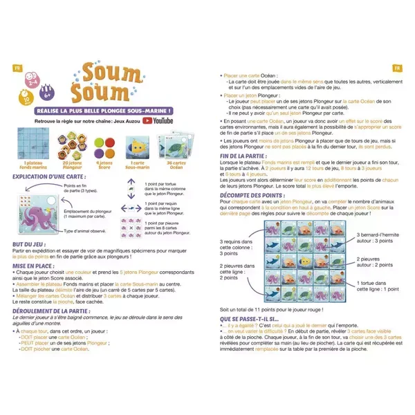 Un groupe de jeunes plongeurs s’aventurent sous l’eau pour observer les animaux. Place au mieux les cartes Océan et tes jetons plongeurs pour réussir la plus belle plongée ! Contenu : 1 plateau, 24 jetons, 35 cartes