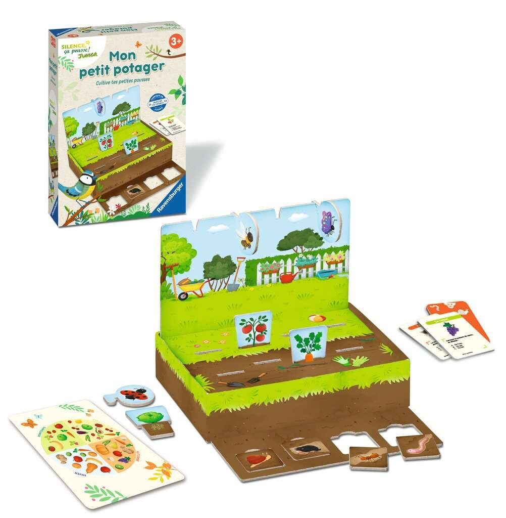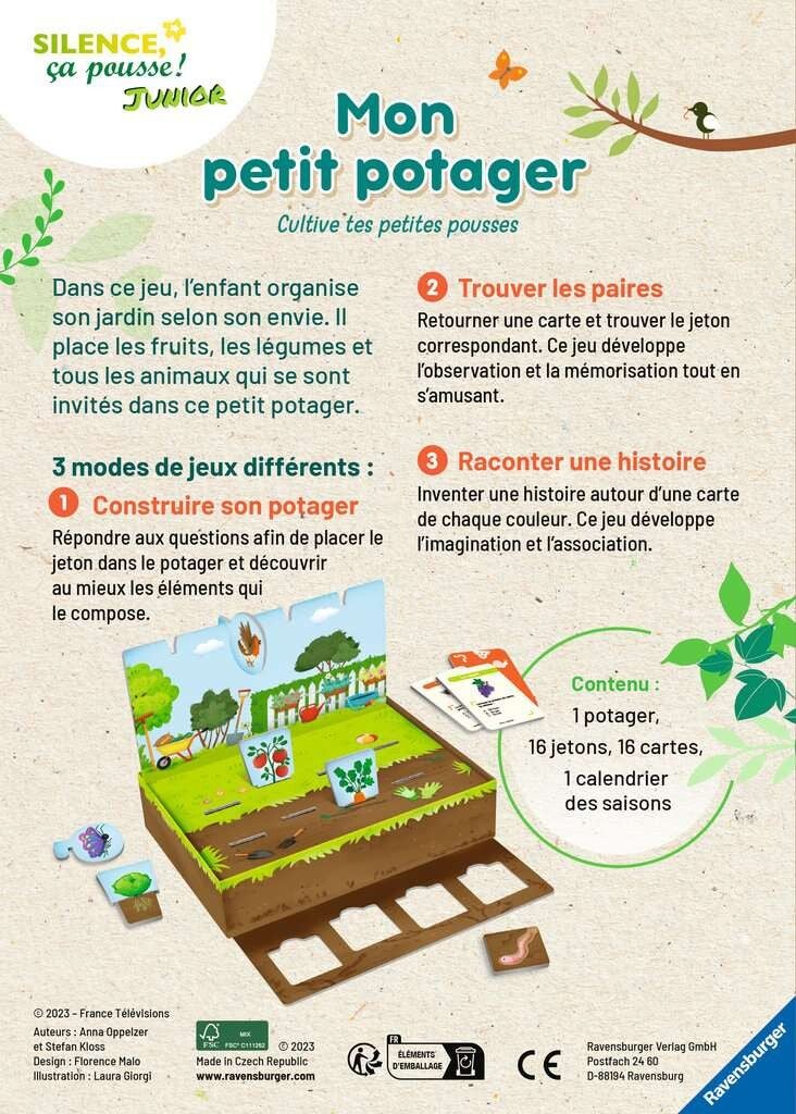 Incroyable : la tomate est un fruit ! L'enfant apprend des informations passionnantes tout en construisant son potager. Mon petit potager propose plusieurs modes de jeu pour développer sa culture, sa mémoire ou encore sa créativité ! Il suffit de quelques secondes seulement pour se familiariser avec la totalité des règles. Une fois le matériel installé, toute la famille est prête à jouer !L'objectif est très simple : être celui qui ajoute le plus d'éléments dans le potager en répondant correctement aux questions. Ce jeu permet aux jeunes enfants de développer leur motricité fine tout en apprenant des informations passionnantes sur le potager. Après quelques parties et une fois que les enfants sont à l'aise avec le matériel de jeu, ils sont même capables de jouer seuls sans avoir besoin d'un adulte ! D'autres modes de jeux simples sont à découvrir en famille. Ce produit est composé de matériaux issus de forêts bien gérées certifiées FSC®, de matériaux recyclés et de matériaux issus d’autres sources contrôlées (FSC-C111262).