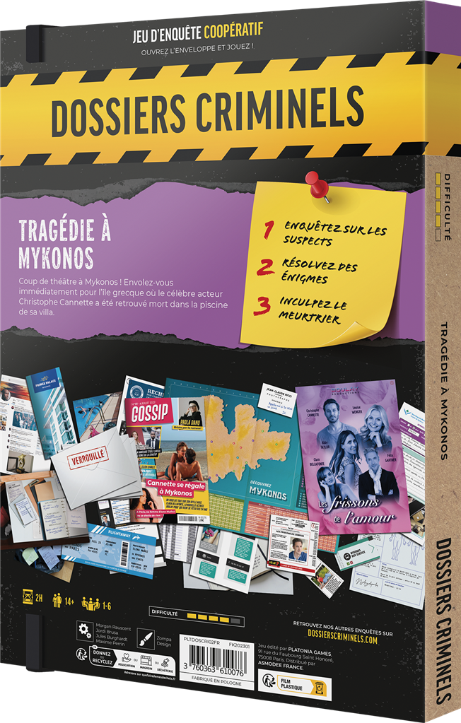 Dans Tragédie à Mykonos, Christophe Cannette, célèbre acteur de séries TV, est retrouvé mort dans la piscine de sa villa à Mykonos. Rétablissez la chronologie des événements, dressez la liste des suspects et enquêtez afin de faire la lumière sur cette affaire.