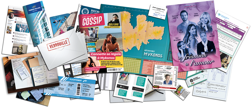 Le dossier criminel contient des témoignages, des coupures de magazines, un plan de l’île de Mykonos, et une multitude d’autres documents… En résolvant des énigmes, vous déverrouillerez 5 enveloppes contenant des preuves supplémentaires.