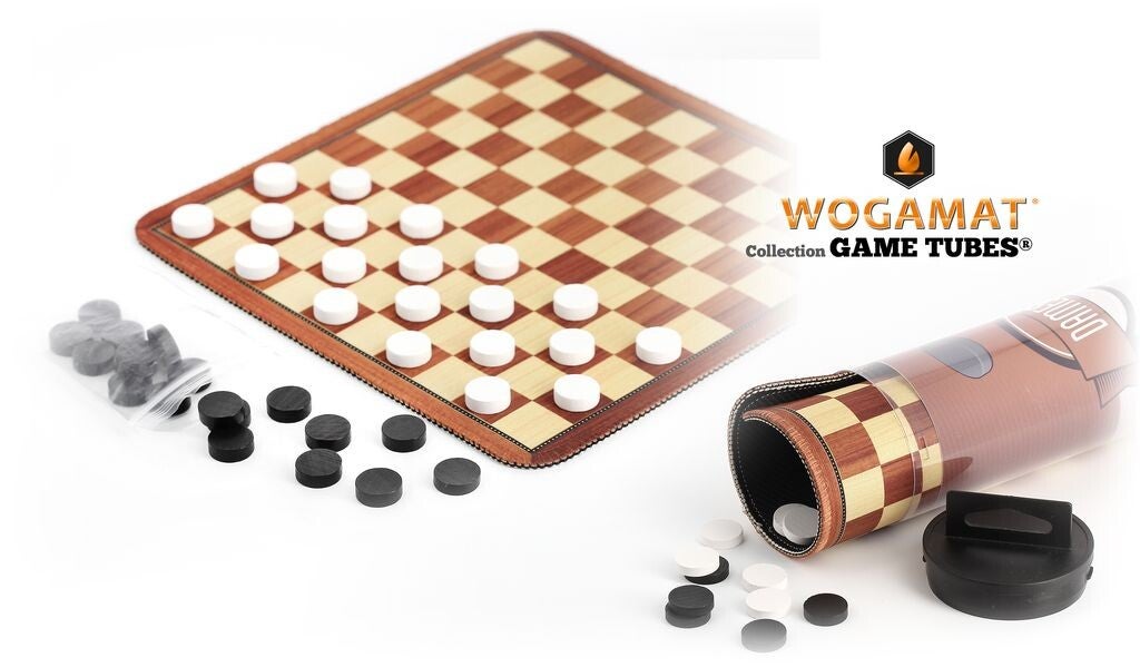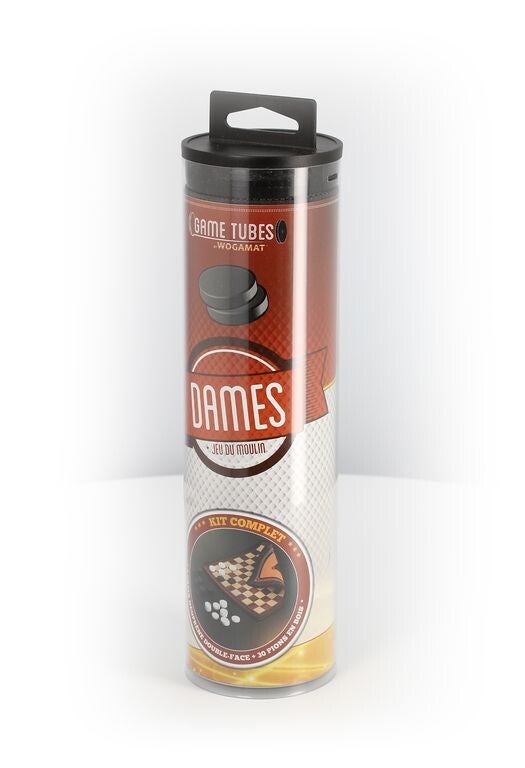 GAME TUBES®, les grands classiques du jeu de société revisités en kits complets dans un tube à emporter partout ! Kit complet Dames / Jeu du Moulin avec matériel et règles de jeu.