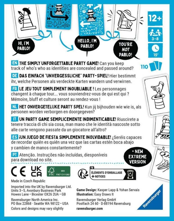 Dans cette version vous changez sans arrêt de personnalités et essayez de vous souvenir qui est qui à chaque instant. Mémoriser 2 personnalités ça a l'air facile ? Pourtant à peine mémorisée vous avez déjà oublié qui vous étiez…et vous voici avec une personnalité inconnue. Si vous n’êtes pas sûrs de qui vous êtes, bluffez de manière suffisamment convaincante ... ou annoncez un nouveau personnage qui regroupe les critères de plusieurs cartes pour embrouiller vos adversaires !Ce dernier pourra soit vous croire et vous accepter, soit le refuser en disant que vous mentez sur votre personnalité… au risque de se tromper et récupérer un point négatif !Un jeu de mémoire... ou du moins où il faudra prétendre en avoir. Simple, surprenant et … simplement inoubliable.