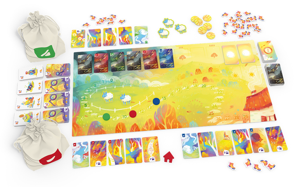Lors d’une partie, vous allez faire 5 balades. Chacune se compose d’un nombre de tours au cours desquels vous piochez en même temps deux tuiles dans votre sac et en placez une devant vous. L’autre retourne habituellement dans votre sac. De tour en tour, vous formez ainsi votre balade jusqu’à ce que vous décidiez de rentrer ou que vous soyez surpris par la tempête. En effet, si des tuiles tempête sont piochées, elles sont ajoutées à la piste météo, s’il y en a trop, les promeneurs sont surpris et ne gagneront pas les points donnés par les animaux qu’ils ont croisés sur leur parcours. Un petit côté stop ou encore dans un paysage bucolique et apaisant ! Mais durant votre balade, achetez de nouvelles tuiles à mettre dans votre sac pour améliorer vos parcours et récolter le plus de points possibles.