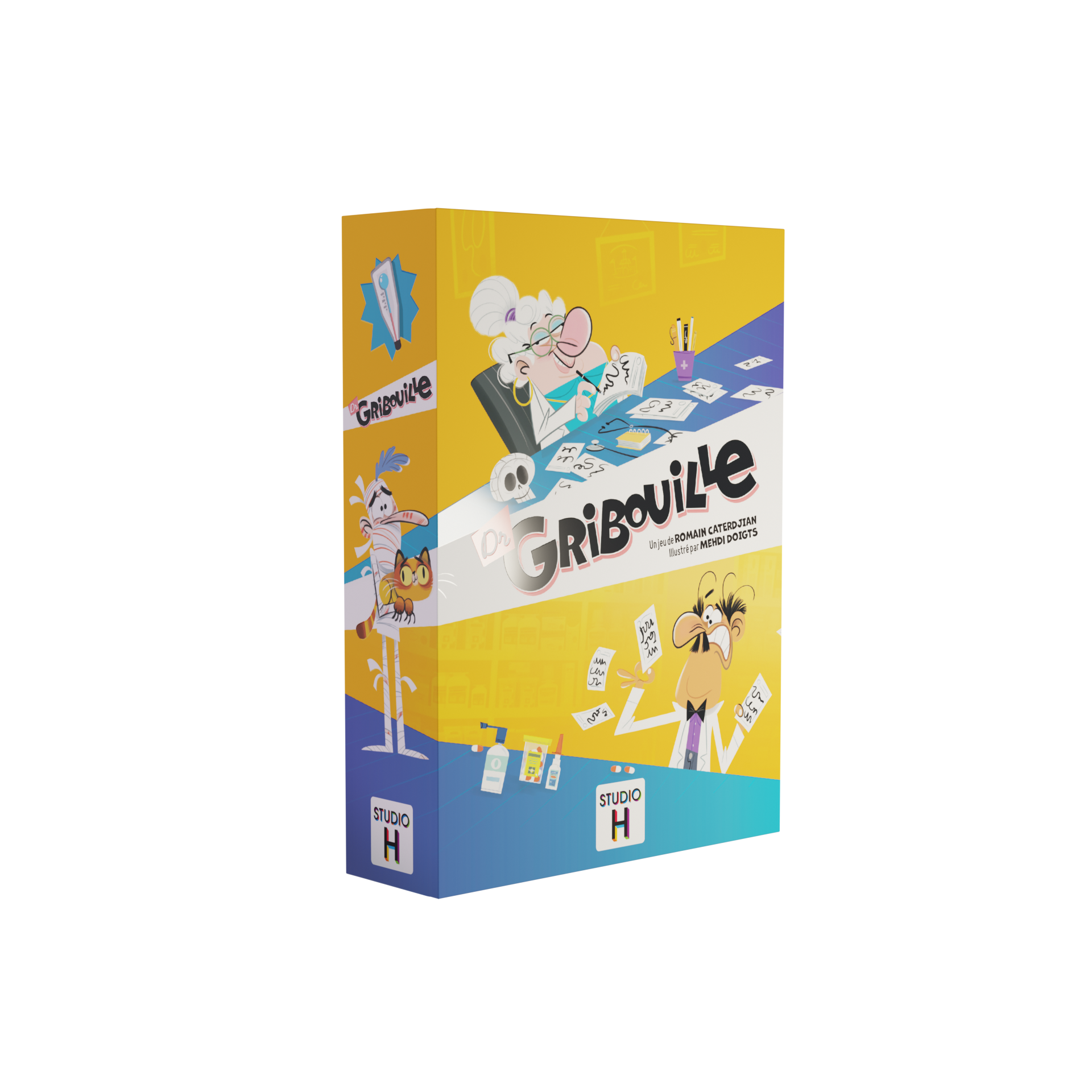 Chaque manche, un des joueurs incarne Dr. Gribouille et doit rédiger l’ordonnance la plus claire possible… en 25 secondes. Les autres jouent les pharmaciens et doivent déchiffrer rapidement l’écriture du médecin pour retrouver les bonnes syllabes parmi leur stock de pillules. Chaque médicament correctement reconstitué augmente la santé du patient de 1.