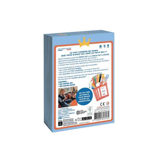 Un jeu qui reconnecte et réunit toutes les générations : enfants, adultes, parents, ados, grands-parents... Des parties rapides, qu'on a envie de relancer. Des règles simples à comprendre et à expliquer. Du challenge, du quiz, des coups bas, un peu de stratégie et surtout des fous rires garantis ! Des centaines de catégories absurdes, fantaisistes, inattendues, spéciales kids qui promettent des parties surprenantes et hilarantes. Avec CRACK LIST La récré, c'est l'heure de la récré pour les enfants comme pour les parents.