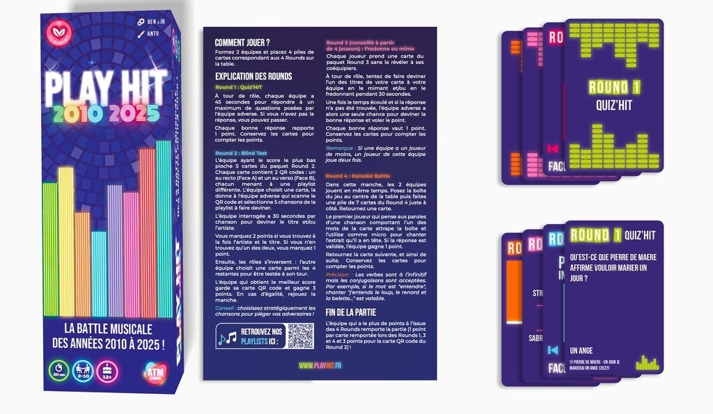 MANCHE 2 : BLIND TEST Choisissez un QR code correspondant à un style et une décennie avec votre équipe. L’équipe adverse scanne votre carte, et choisit stratégiquement 5 musiques au sein de la playlist à vous faire écouter. Ensuite, inversez les rôles. L'équipe qui a trouvé le plus de titres ou d'artistes remporte la manche et marque 3 points.
