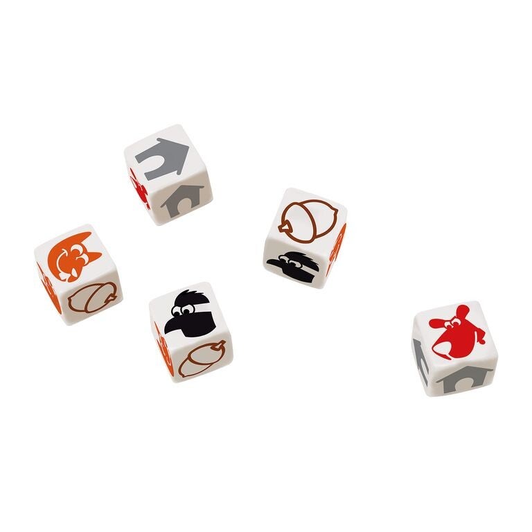 À son tour, un joueur lance les 5 dés Écureuil pour tenter de récolter des Noisettes (1 point) tout en évitant les Geais (0 point). Après chaque lancer, il peut choisir de s’arrêter et marquer ses points, ou continuer en relançant les dés Écureuils et Noisettes restants. Mais attention : s’il ne sort que des Geais ou que des Écureuils, il perd tous ses points du tour ! Et si cela arrive… c’est la Course aux Noisettes ! : il relance frénétiquement ses dés pendant que les autres joueurs essaient de sortir un Chien avec leur dé unique. Dès que tous les chiens aboient, il doit s’arrêter ! Soyez le premier à atteindre 50 points ou plus. Mais gare aux geais et aux chiens qui peuvent tout faire basculer !