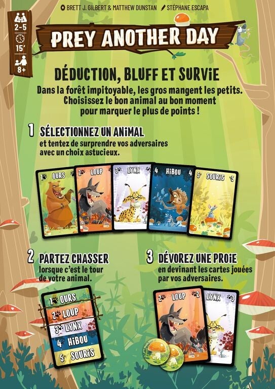 Dans la forêt impitoyable, les gros mangent les petits. Ours, Loup, Lynx, Hibou et Souris partent en chasse ! Choisissez votre proie avec sagesse sans être dévoré à votre tour pour remporter la partie. Bluff et déduction sont vos meilleurs alliés dans cette quête pour la suprématie de la forêt.