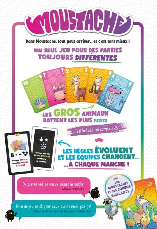 Moustache est un jeu de plis à rebondissements, pour 3 à 6 joueurs. À chaque manche, les équipes sont redéfinies aléatoirement et une nouvelle règle vient chambouler la partie : hiérarchie des couleurs inversée, jokers délirants, effets de cartes... Rien n’est jamais figé ! Grâce à un système de règles évolutives et de cartes Équipe, chaque partie est unique et pousse à l’adaptation constante. On y retrouve le plaisir immédiat du jeu de plis, enrichi d’un goût de chaos contrôlé. Facile à apprendre, drôle à jouer, idéal pour animer une soirée famille ou amis.