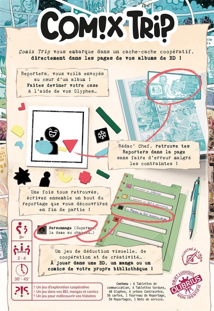 Comix Trip est un jeu coopératif en communication limitée. Prenez n’importe quel album de bédé et faites deviner la case qui vous a été désignée à l’aide de vos pions Glyphe. Réussissez tous ensemble à écrire un ‘reportage’ au cœur même de vos albums préférés !