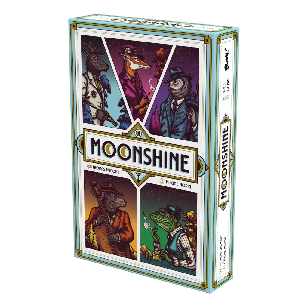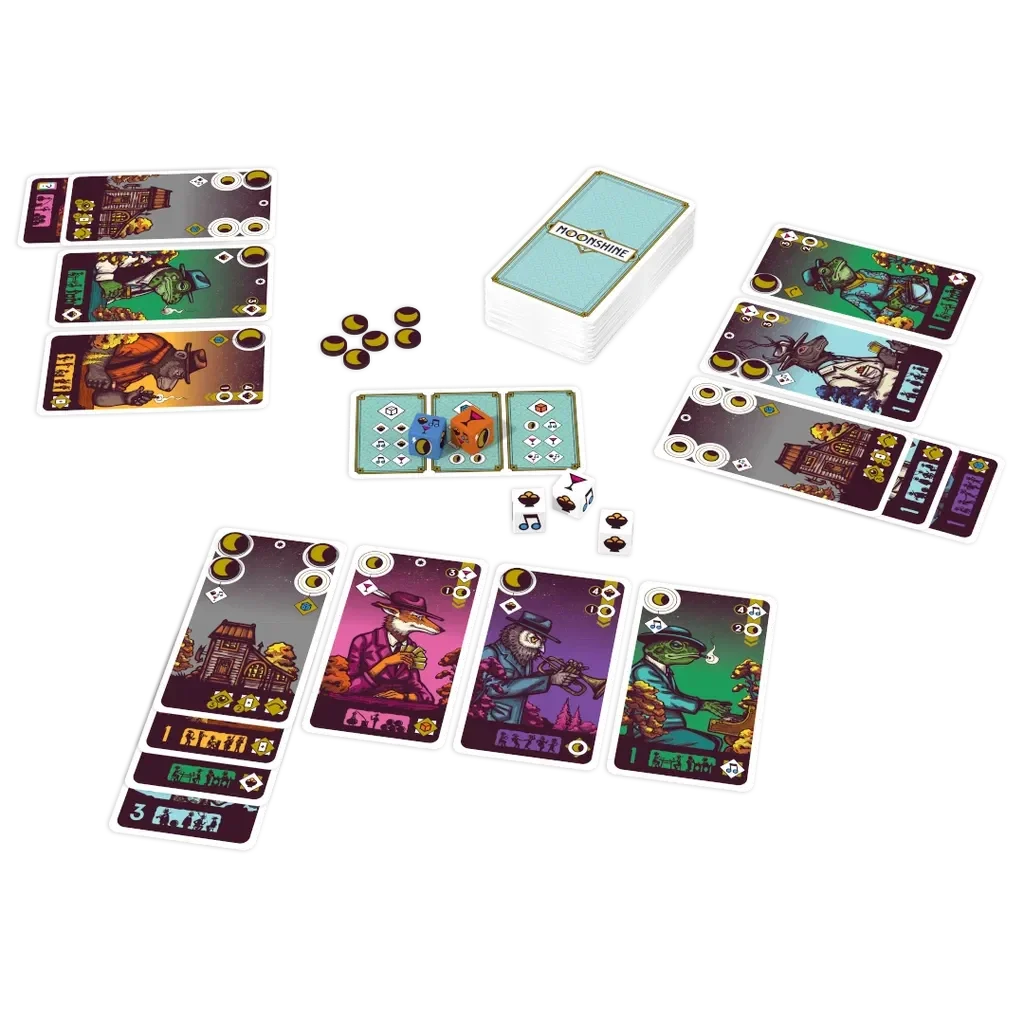 Moonshine est un jeu de construction de moteur avec des dés dans lequel les joueurs jouent en simultané. A chaque tour de jeu, chacun exploite le résultat des dés obtenu par le joueur actif, afin de renforcer l'attrait de son bar clandestin. Le but du jeu est d'attirer suffisamment de clients pour atteindre 12 points de prestige. Lorsqu'un joueur y parvient, la partie se termine alors et c'est celui ou celle avec le plus haut score qui l'emporte. Une partie consiste en une succession de tours, qui se déroulent tous de la même manière : d'abord le joueur actif lance - et éventuellement relance - tous les dés auquel il a accès pour valider un pool de dés. Puis chaque joueur dispose des icônes obtenues comme ils le souhaite. Ces icônes représentent des ressources interdites prisées de clients potentiels (chaque joueur dispose de ses propres clients potentiels). Satisfaire les besoins spécifiques d'un client permet de le faire entrer dans son bar et d'ainsi bénéficier de son bonus permanent : points de prestige, ressources, relances, accès à d'autres dés (dés bleu et rouge), à d'autres clients potentiels, etc. Si jamais un joueur ne veut pas ou ne peut pas exploiter le résultat des dés, il n'est pas bloqué ! Il peut soit récupérer un jeton Lune à placer sur l'une de ses cartes afin de débloquer un bonus temporaire; soit remplacer l'un de ses clients potentiels par un nouveau. Le jeu contient également une variante avec un départ asymétrique : chaque bar clandestin dispose ainsi de capacités et de bonus temporaires complètement différents !
