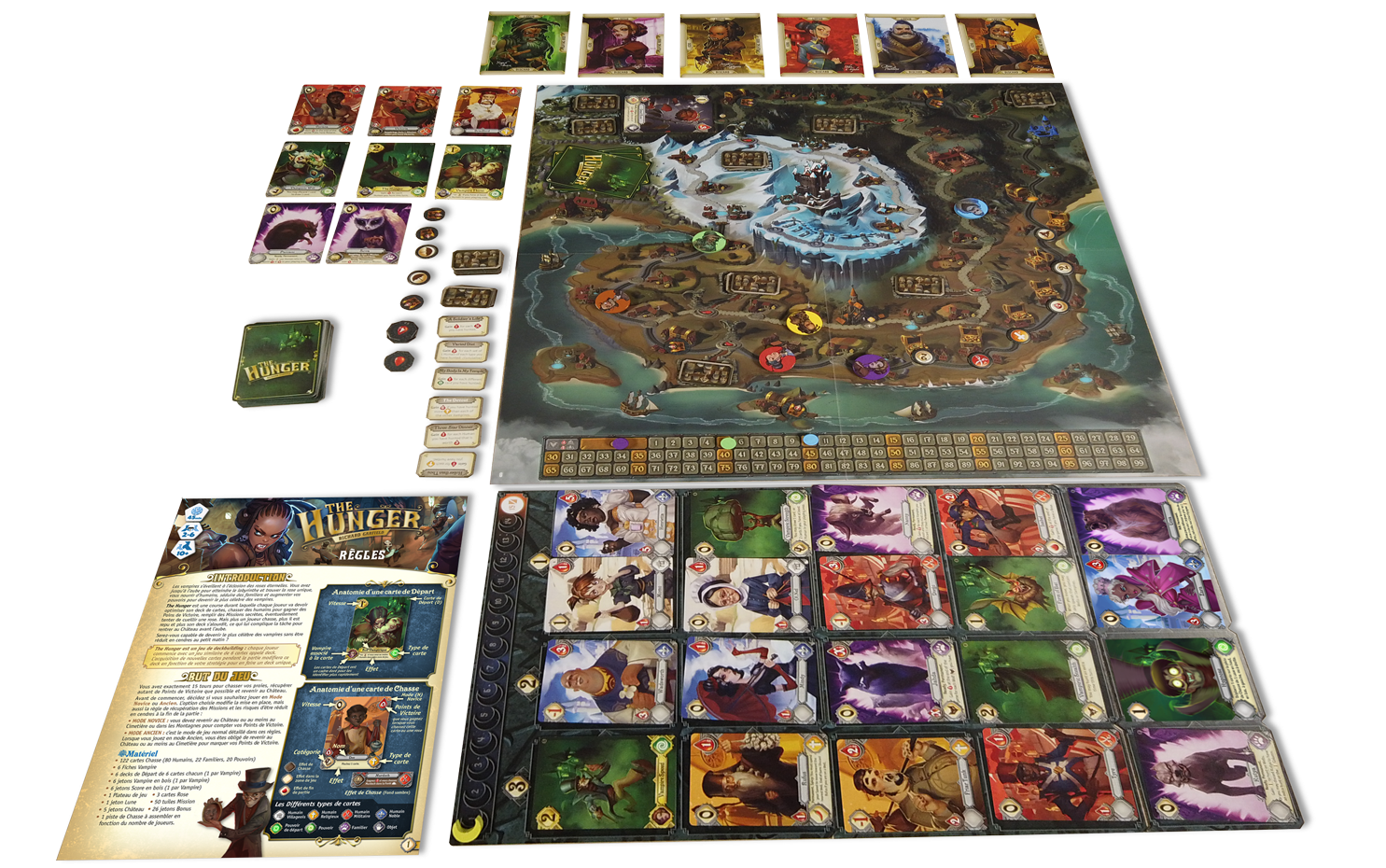 Dans The Hunger, parcourez le plateau en quête des proies les plus alléchantes en points de victoire, de vos familiers et de la rose éternelle… Chassez les bonnes cartes pour optimiser votre jeu et cibler les bonnes proies sans trop vous alourdir ! Recherchez des