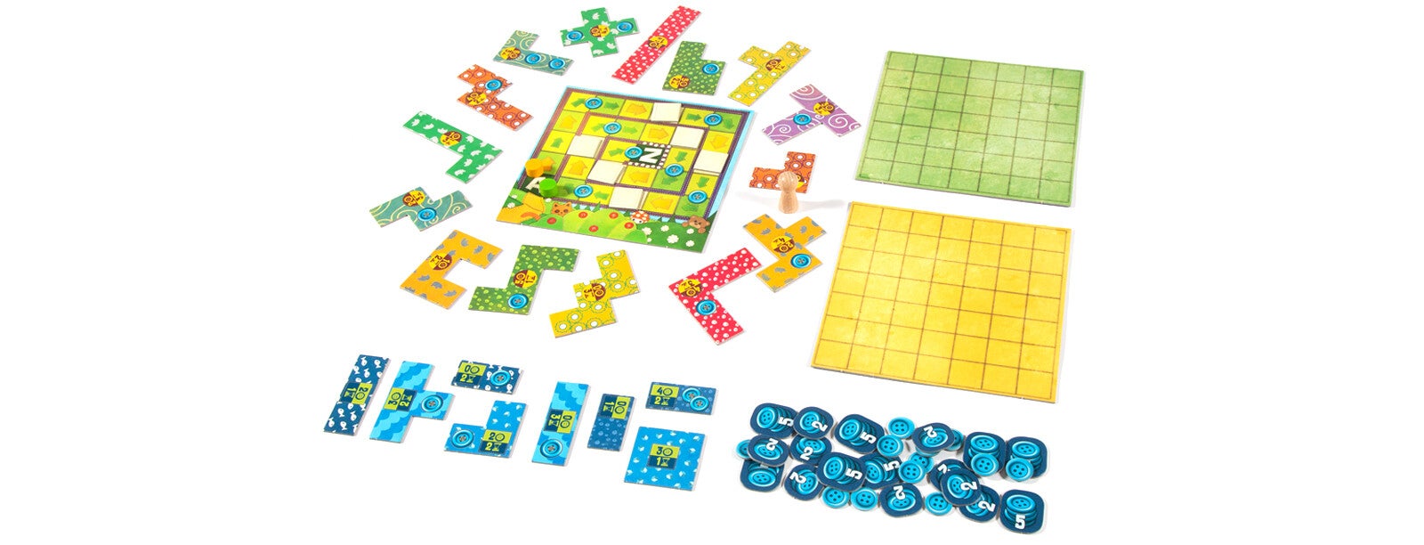 Chacun son tour, les joueurs achètent un bloc de tissu au choix parmi trois au choix ou passe son tour. Une fois le bloc acheté, placez-le sur votre plateau de jeu, en veillant à ne pas le superposer avec les blocs qui y sont déjà ! Attention - à la fin de la partie, le joueur avec le plus de boutons et le moins de trous dans sa couverture gagne !