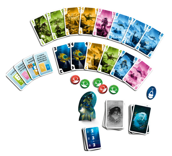 • Contenu : 40 cartes Océan, 5 cartes Rappel, 96 cartes Tâche, 6 jetons, 1 pion Commandant, 1 journal de bord et 1 livret de règles.