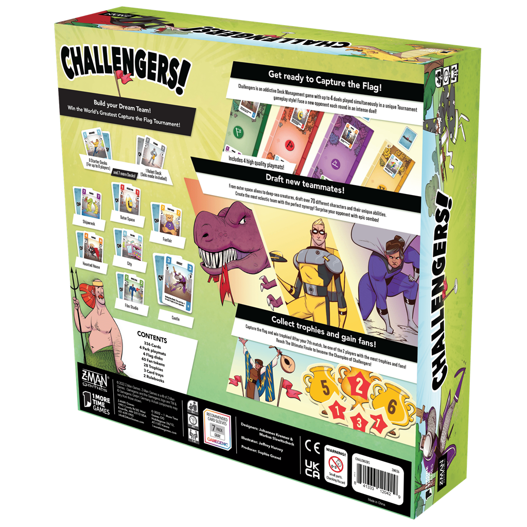Dans Challengers, vous êtes le sélectionneur. Par une mécanique de deck building astucieuse, vous allez constituez votre paquet et l'améliorer au fur et à mesure des affrontements. Choisissez les bons éléments de votre équipe, imaginez les combinaisons et les synergies qui vont pouvoir se créer. C'est votre sélection qui va faire de vous un potentiel vainqueur ! Pendant le match, votre équipe devra se débrouiller toute seule, il sera trop tard !