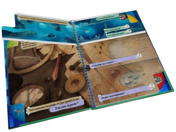 Crée ta propre histoire : à chaque page coupée en trois, tu devras faire un choix. Ouvre le livre et choisis ton sous-marin sur la roue rouge : L'Espadon, fin et rapide ? La Manta, gracieuse et maniable ? Ou Le Béhémoth, gros et solide ? Maintenant, ton aventure peut commencer. Tu vas pouvoir lire ce livre normalement, de gauche à droite, mais rapidement, tu feras face à des choix matérialisés par des pages coupées en trois. Tourne la partie de ton choix et découvre ce qui va se passer. Après plusieurs choix, tu arriveras à la fin de ton exploration… Trouveras-tu le mystérieux trésor englouti ? Une fois la lecture terminée, tu peux recommencer pour découvrir de nouveaux chemins et/ou essayer avec un autre personnage.